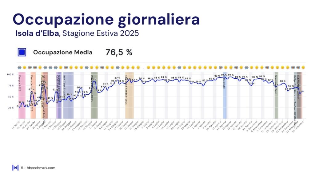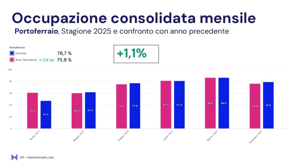 • Il tasso di occupazione consolidato del periodo di 18 Aprile-30 Settembre ha fatto registrare un aumento di 0,5 punti percentuali vs. 2024 (+0,7%) passando dal 76% del 2024 al 76,5% della stagione 2025. Aprile, Agosto e Settembre hanno fatto registrare un calo, Maggio in linea, Giugno e Luglio in incremento;