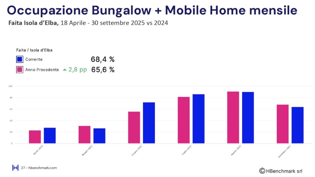 Per quanto riguarda il dettaglio Bungalow + Mobile Home, il tasso di occupazione è stato pari al 68% (+2,8 pp), confermando un trend positivo analogo a quello generale, con un picco anche nei ponti di primavera.
