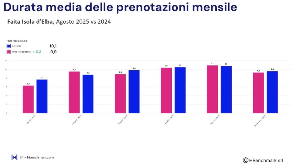 • La Durata Media delle prenotazioni è rimasta invariata sulla stagione precedente in generale e per tutte le categorie, con un calo su aprile e maggio, un aumento su luglio e agosto e senza variazioni su giugno e settembre;
